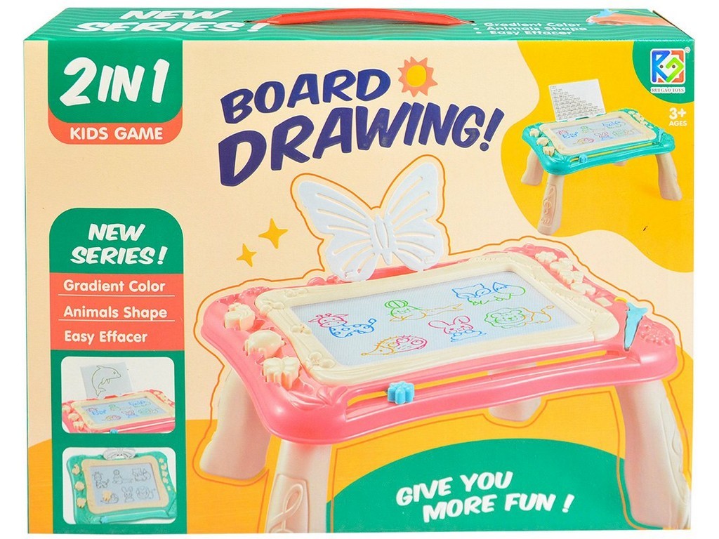Tabulka magická 2 v 1.Kreslící tabule je skvělou hračkou při první nauce psaní, kreslení a rozpoznávání písmenek. Tabule je vyrobena z kvalitního plastu bez ostrých hran. Tabulka má dva druhy použití. Můžete ji použít samostatně nedo snadno nasadit přiložené nohy a používat tabulku jako stoleček.Rozměr: 40 x 37 x 75 cmMateriál hračky je plast.Doporučený věk: 3 +