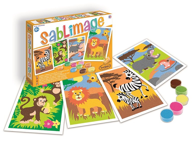 S touto sadou mohou oživit africkou divočinu i ti nejmenší, a to bez jejich zašpinění. Vyberte si obrázek některého z divokých zvířat (lev, opice, hroch, zebra) a můžete začít. Pískové tvoření potěší všechny děti, které mají rádi kreativní tvorbu, malování, a nebo pouze chtějí vyzkoušet něco nového. Je to snadné, stačí odlepit předlepené povrchy jednotlivých obrázků a posypat je různými barvami písku.