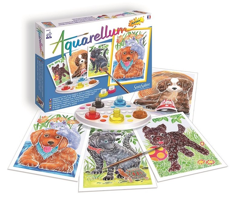 Sada Akvarely junior - Štěňata od francouzské firmy SentoSphere je navržena tak, aby děti snadno pochopily základy míchání barev a kresby na speciálním papíru. Při malování se barvy nesměšují, jsou syté a výsledný obrázek vypadá jako hotové umělecké dílo - a to díky unikátní technice, kdy se vzory objevují téměř samy. Děti se tak nejen baví, ale zároveň stimulují své smysly a kreativitu.