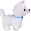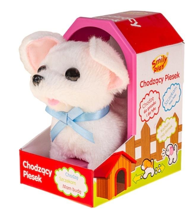 Pokryty pluszem piesek rasy chihuahua, chodzi do przodu i do tyłu. W ruchu szczeka radośnie i rusza głową. Pod brodą, jako obrożę, ma uroczą, niebieską kokardkę.