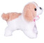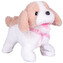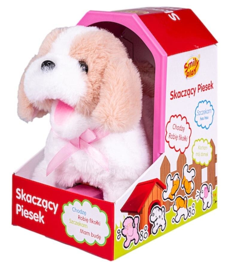 Pokryty pluszem piesek, chodzi do przodu i skacze do góry robiąc salto w powietrzu! W ruchu szczeka radośnie i rusza głową. Pod brodą, jako obrożę, ma uroczą, różową kokardkę. Piesek ma miłe w dotyku dwukolorowe futerko.
