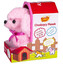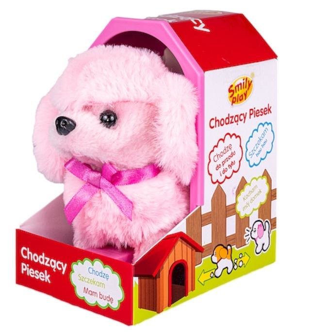 Pokryty pluszem piesek rasy pudel, chodzi do przodu i do tyłu. W ruchu szczeka radośnie i rusza głową. Pod brodą, jako obrożę, ma uroczą, różową kokardkę. Piesek ma miłe w dotyku futerko.