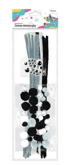 Zestaw: druciki, pompony, oczka 80szt. szary. číst celé