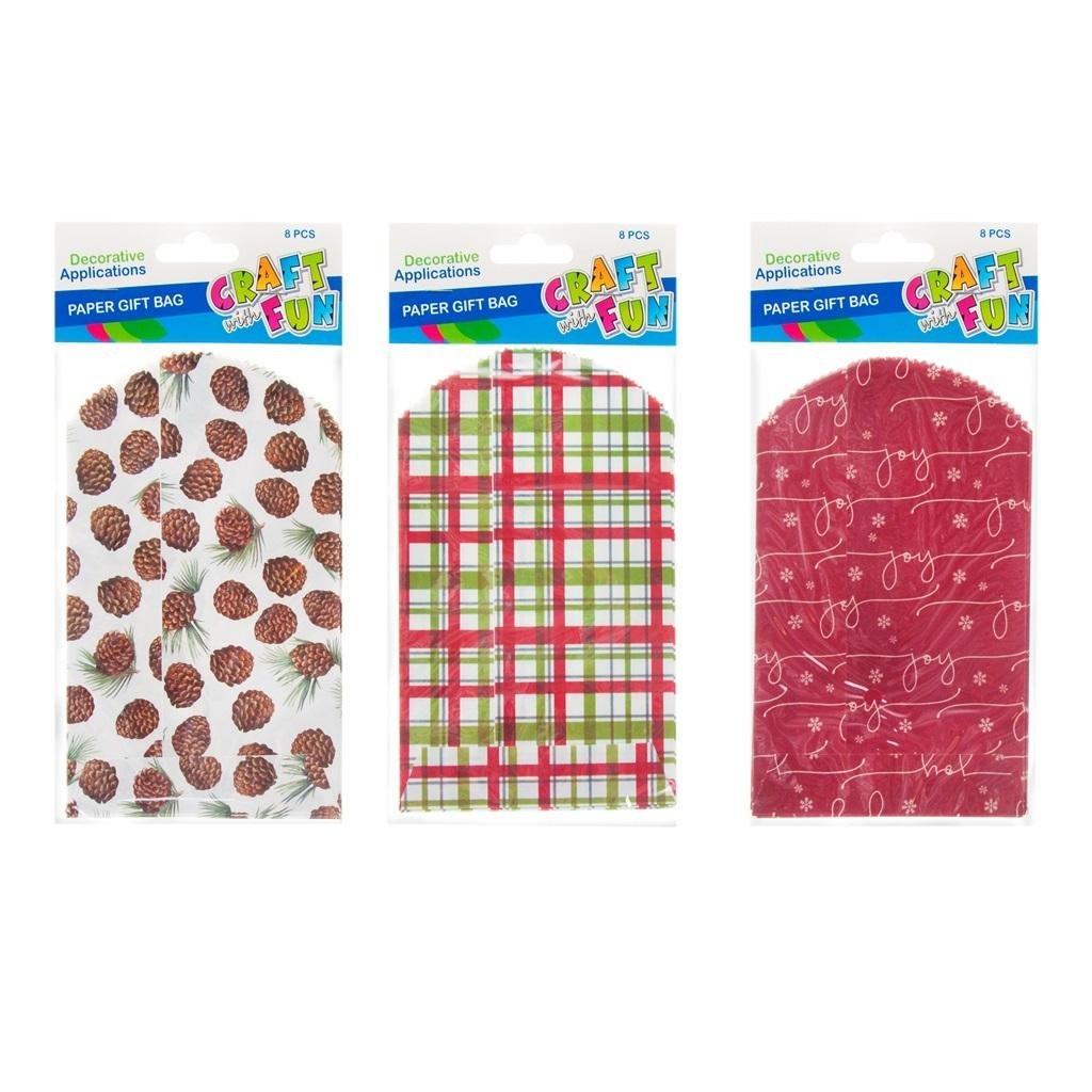 Každý set obsahuje 8 kusov papierových taštičiek v rozmere 12 x 16,5 cm, ideálnych na rôzne balenie - od drobných suvenírov až po pekné aranžovanie produktov pre vašu domácnosť alebo obchod. Sortiment je mix rôznych motívov a farieb, čo prináša vyváženú kombináciu elegancie a univerzálnosti. Vďaka papierovému materiálu sú šetrné k životnému prostrediu a dajú sa ľahko recyklovať alebo použiť viackrát.