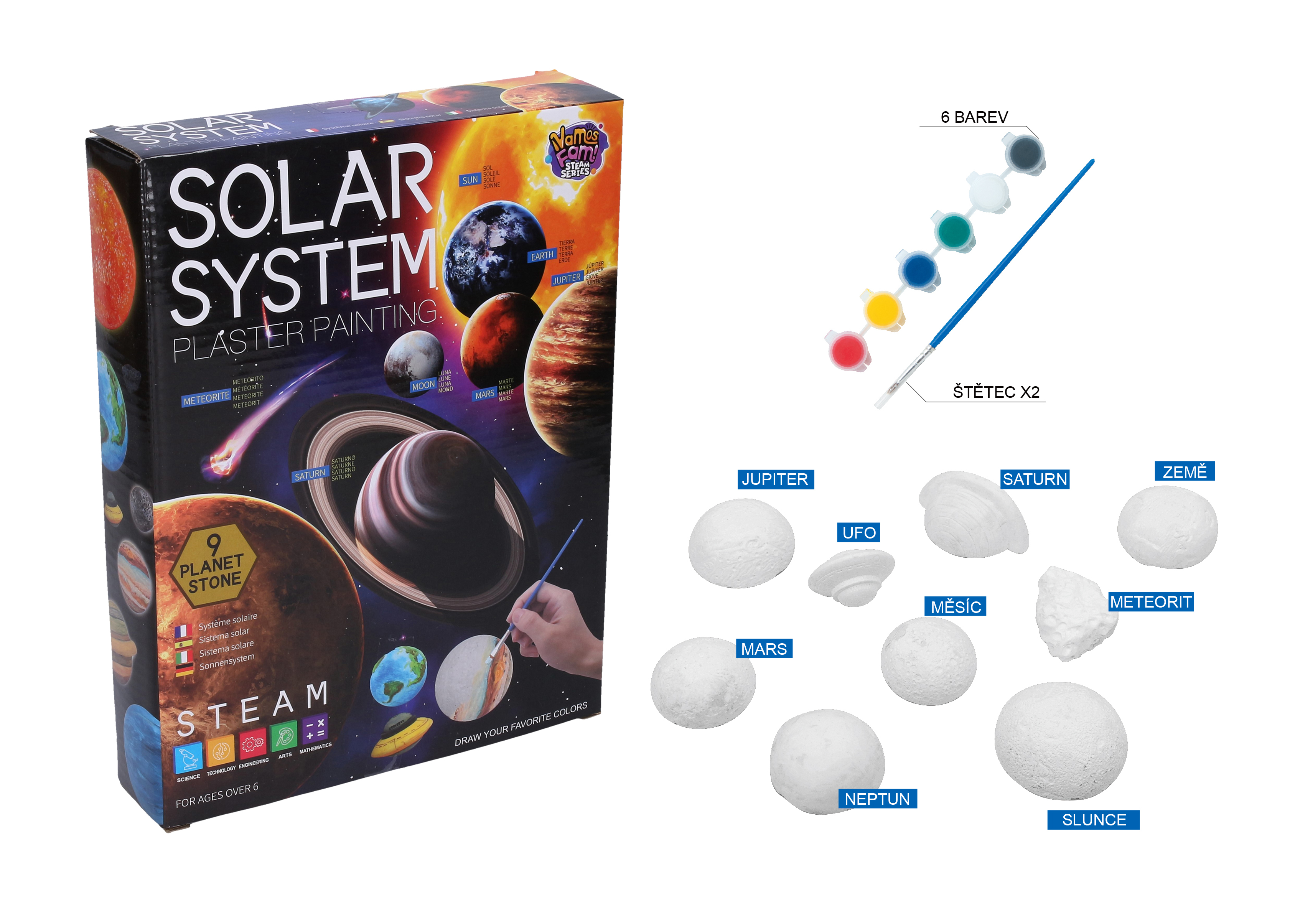 Sluneční soustava - malování. Součástí model Země, Mars, Jupiter, Saturn, Neptun, Slunce, Měsíc, meteorit, UFO, 2 štětce, barvy, návod jak míchat vzájemně barvy na zadní straně obalu. Velikost modelů 4 až 5 cm. číst celé
