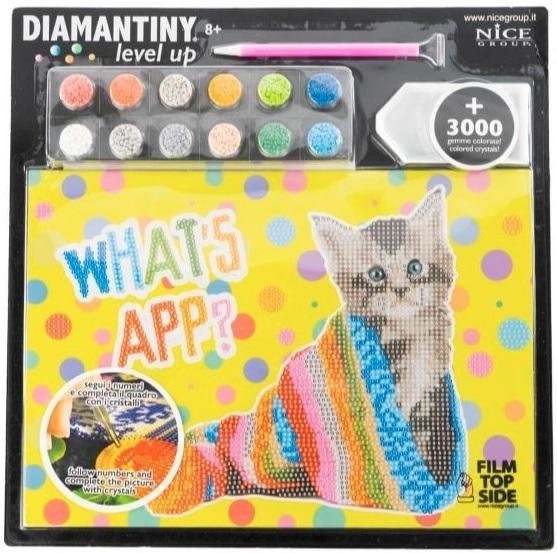 Zestaw z kryształkami do tworzenia mozaiek z kolorowymi kamieniami. Zabawa z mozaiką diamentową polega na układaniu obrazka z tysięcy malutkich, kolorowych diamencików według naniesionego na kartonie nadruku. Obrazek pokryty jest warstwą klejącą, która utrzymuje kryształki na odpowiednich miejscach. Kompletny zestaw do wykonania mozaiki zawiera: obrazek nadrukowany na grubej tekturze, na którym naniesione są literki i cyferki wskazujące miejsca, gdzie należy ułożyć poszczególne kolory; diamenciki w różnych kolorach; aplikator z woskiem, pojemnik na diamenciki oraz przewodnik po kolorach.Zawartość: