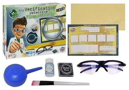 Zestaw Detektywistyczny Badanie Odcisków Palców Przedstawiamy laboratorium prywatnego detektywa. Zestaw pozwala przeprowadzić prawdziwe śledztwo i wykryć przestępstwo, zbiega. Zestaw wykonany z wysokiej jakości materiału, zapewnia rozwój wyobraźni. Zestaw składa się z 11 elementów. Czy wiesz, że szukanie i analizowanie odcisków palców jest najbardziej znaną pracą kryminalistyki. Kiedy ludzie dotykają przedmiotów, na czubku palca pozostaje trochę tłuszczu czy potu, czyli pozostają pewne możliwe do zidentyfikowania znaki. Każdy odcisk palca jest wyjątkowy i nigdy nie będzie taki sam. Wymiary pudełka: 22 cm x 17 cm x 5 cm Zestaw przeznaczony jest dla dzieci powyżej 8. roku życia. Zestaw posiada certyfikat CE i jest zgodny z normą EN 71. Zapakowany jest w kartonik z naukową grafiką, dzięki czemu nadaje się idealnie na prezent.
