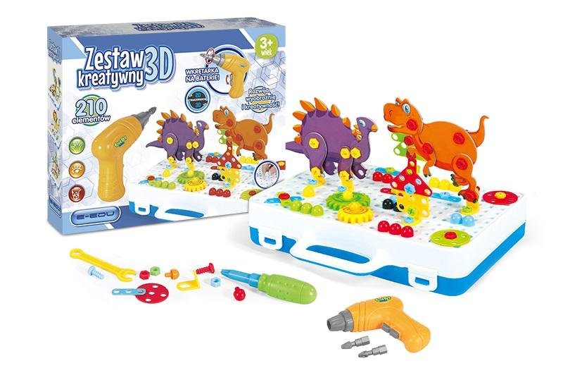 W zestawie: walizka z podkładką do wkręcania, wkrętarka, 2 końcówki do wkrętarki, klucz, śrubokręt, 3 plansze z dinozaurami do skręcania, 5 kół zębatych, 60 kolorowych znaczników, 40 śrubek, 40 podkładek pod śrubki, 40 podkładek w różnych kształtach i kolorach, 12 łączników/stojaków na dinozaury, 3+