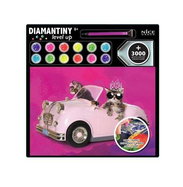 Zestaw z kryształkami do tworzenia mozaiek z kolorowymi kamieniami. Zabawa z mozaiką diamentową polega na układaniu obrazka z tysięcy malutkich, kolorowych diamencików według naniesionego na kartonie nadruku.Obrazek pokryty jest warstwą klejącą, która utrzymuje kryształki na odpowiednich miejscach. Kompletny zestaw do wykonania mozaiki zawiera: obrazek nadrukowany na grubej tekturze, na którym naniesione są literki i cyferki wskazujące miejsca, gdzie należy ułożyć poszczególne kolory; diamenciki w różnych kolorach; aplikator z woskiem, pojemnik na diamenciki oraz przewodnik po kolorach.
