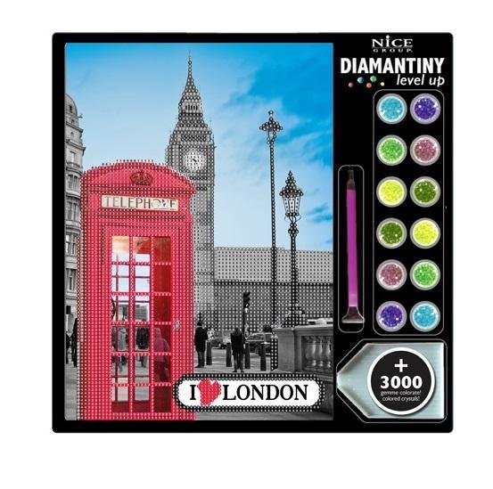 Zestaw z kryształkami do tworzenia mozaiek z kolorowymi kamieniami. Zabawa z mozaiką diamentową polega na układaniu obrazka z tysięcy malutkich, kolorowych diamencików według naniesionego na kartonie nadruku.Obrazek pokryty jest warstwą klejącą, która utrzymuje kryształki na odpowiednich miejscach. Kompletny zestaw do wykonania mozaiki zawiera: obrazek nadrukowany na grubej tekturze, na którym naniesione są literki i cyferki wskazujące miejsca, gdzie należy ułożyć poszczególne kolory; diamenciki w różnych kolorach; aplikator z woskiem, pojemnik na diamenciki oraz przewodnik po kolorach.