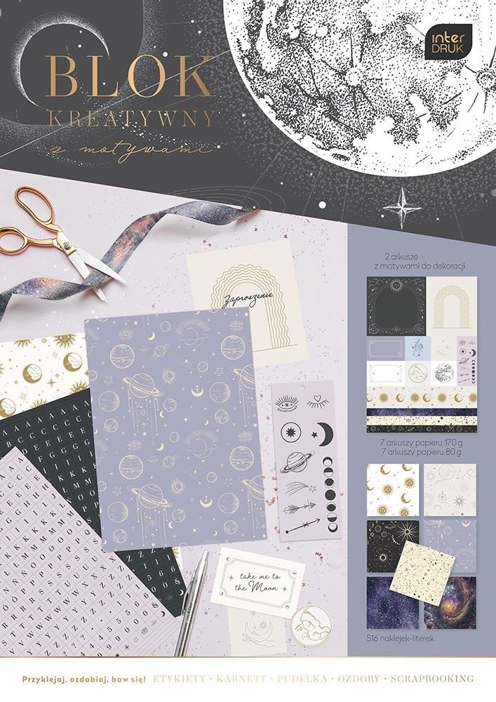 Blok kreatywny idealnie sprawdzi się w różnych pracach plastycznych, umożliwiając wykonanie własnych etykiet, karnetów, pudełek, ozdób czy scrapbookingu. W środku: 516 naklejek - literek, 2 arkusze z motywami dekoracyjnymi, 7 arkuszy papieru z motywami 170 g i 7 arkuszy papieru z motywami 80 g.