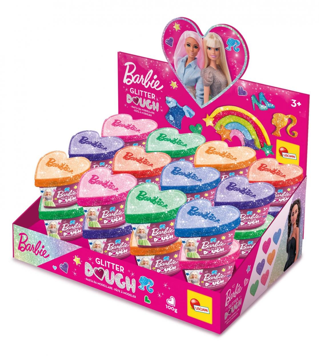 Pojemnik w kształcie serca z błyszczącą masą i pieczątka z symbolem Barbie, które znajdziesz pod pojemnikiem.
