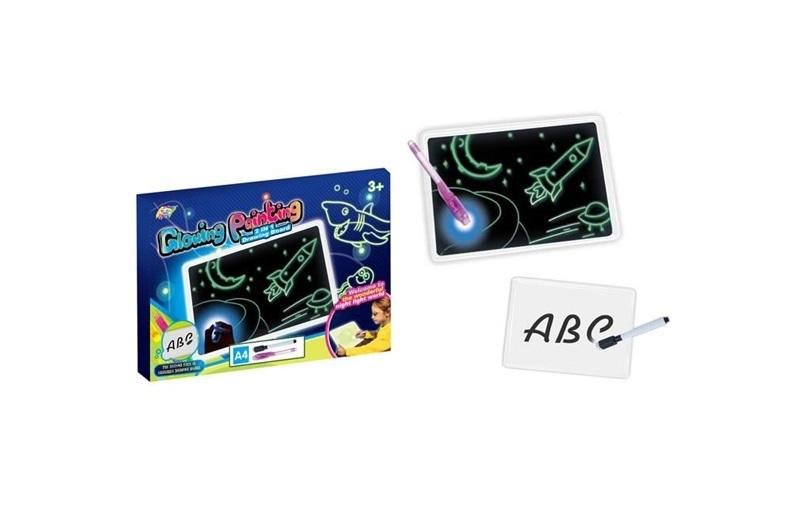 W zestawie: dwustronna tablica, świecący długopis, pisak z gąbką do zmazywania, 2 szablony z wzorami, instrukcja, funkcje: na jednej stronie można malować ścieralnymi pisakami, druga strona jest pokryta powłoką luminescencyjną, która pozwala na malowanie w ciemności, wym. Opk: 32,5 x 23 x 2,5 cm., Baterie: 3 x ag13 załączone demonstracyjne, 3+