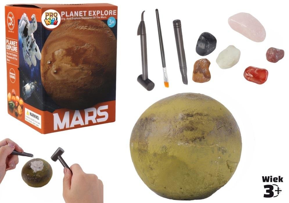 Odkryj kosmiczne skarby z zestawem "Wykopaliska Minerałów Planeta"! W środku gipsowej planety ukryty jest magiczny kryształ, który czeka, byś go odkrył. Używając dołączonych narzędzi - pędzla, dłuta i młotka - oraz kierując się instrukcjami, dzieci powyżej 4. roku życia mogą wydobyć minerał, ucząc się przy tym o kosmosie. Każda planeta kryje inny kamień, a dołączony katalog pozwoli zgłębić tajemnice minerałów. Bezpieczna, edukacyjna i kreatywna zabawa, nie wymagająca baterii, z realistycznymi kolorami planet. Idealna dla małych kosmicznych odkrywców!