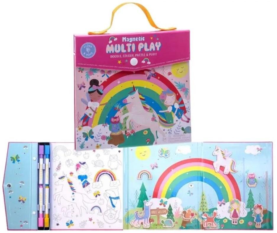 Sada obsahuje magnetickou skládačku složenou z 20 dílků, díky níž děti mohou vytvářet barevné obrázky s motivy jednorožců, víl, lamy na kolečkových bruslích a motýlů. Součástí jsou také čtyři barevné fixy s praktickými suchými guma na mazání, které umožňují kreslení a vybarvování přímo na magnetických deskách. Set je uzavřen v kompaktním, skládacím boxu s pohodlným madlem, takže je snadné ho vzít na cesty či do přírody. Všechny komponenty jsou navrženy tak, aby i kreativní hra byla bez nepořádku a ekologicky šetrná.