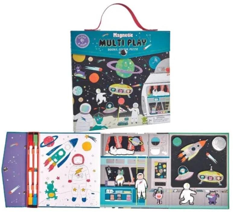 Układaj puzzle, rysuj, koloruj i baw się! Zestaw Magnetyczny Kosmos to cztery ulubione i popularne zabawy w jednym pudełku, które gwarantują dzieciom świetną i kreatywną zabawę na wiele godzin. Po rozłożeniu zestaw odsłania atrakcyjną układankę składającą się z 20 magnetycznych elementów, 4 kolorowe pisaki z gumkami do wycierania na sucho, plansze do rysowania i pisania oraz magnetyczne rakiety, planety, astronauci i kosmici, które umożliwiają niekończącą się zabawę na planszy magnetycznej. Pudełko składa się na płasko i jest wyposażone w poręczny uchwyt do przenoszenia, dzięki czemu idealnie sprawdza się w podróży oraz do zabawy na świeżym powietrzu. Cechy: