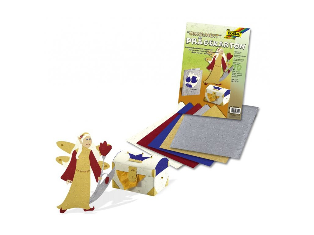 Papíry s embosovanou úpravou ve stylu různých ornamentů, 10 listů 23x33 cm, 220 g. Barevné odstíny: perleťová, tmavě červená, modrá, stříbrná a zlatá.