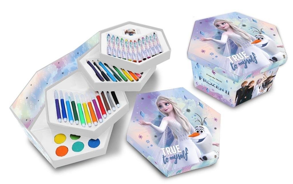 zestaw FROZEN zawiera:gumka do wymazywania: 1szt.kredki woskowe: 12 kolorówtemperówka: 1szt.kredki drewniane: 12 kolorówpisaki: 12 kolorówpędzelek: 1szt.Razem 51 elementówfarbki akwarelowe: 12 kolorów číst celé