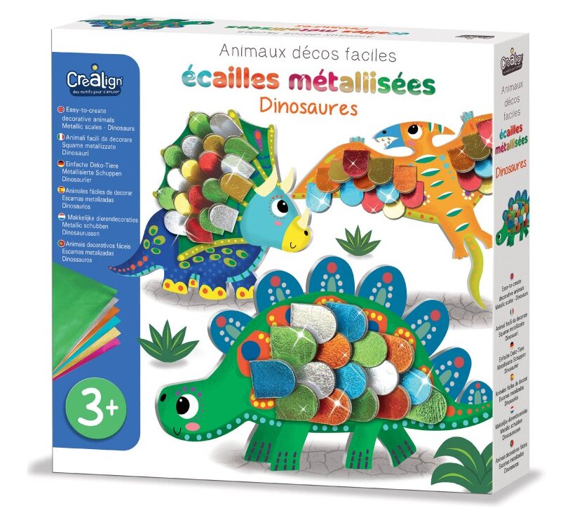 Kreatívna súprava pre deti Tvorenie so šupinami Dinosaury od francúzskej značky Crea Lign z radu Jednoduché obrázky je vhodná už pre deti od 3 rokov. Obsahuje 3 dinosaurami z tvrdého kartónu, 64 šupín na nalepenie a 6 hárkov s metalickými farbami. Vďaka nim si deti dinosaurami jednoducho dotvoria a vzniknú im originálne 3D obrázky, ktoré si zavesia na stenu.