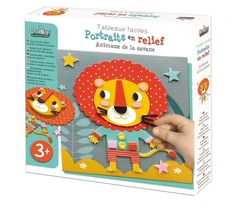 Kreatívna súprava pre deti Penové obrázky Zvieratká zo savany od francúzskej značky Crea Lign z radu Jednoduché obrázky je vhodná už pre deti od 3 rokov. Obsahuje 5 podkladových obrázkov a 5 hárkov farebných penových samolepiek. Vďaka nim si deti všetky zvieratká jednoducho dotvoria a vzniknú im originálne 3D obrázky Nechýba ani 1 stojan na následné vystavenie umeleckého diela.