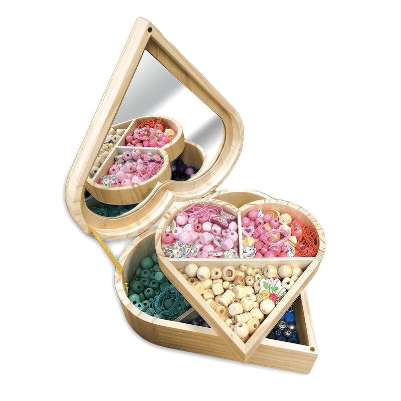 Obsahuje: Krabičku ve tvaru srdce z přírodního dřeva se zrcátkem a přihrádkami, více než 500 korálků různých tvarů a barev.Doporučeno pro děto od 3 let.