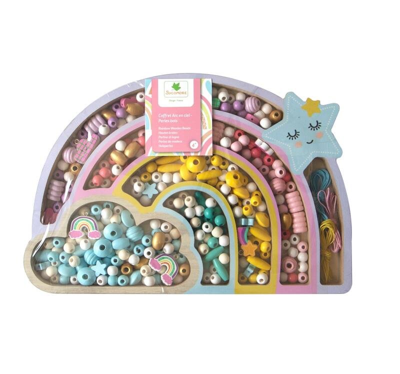 - Bohatá sada obsahující přes 400 kusů barevných dřevěných korálků ve tvaru duhy XL