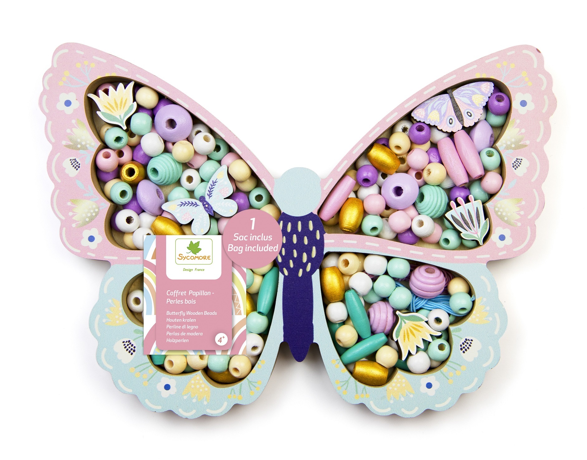 V atraktivním balení najdete dřevěné korálky v pastelových a zlatých barvách, 4 květinové korálky, 4 přívěsky ve tvaru motýlků, 3 metry provázku, organzový sáček na uložení korálků. Rozměry balení jsou 23 x 16,6 x 2 cm. Vyrobeno ze dřeva zodpovědně získaného z lesů, které splňují přísné environmentální standardy.