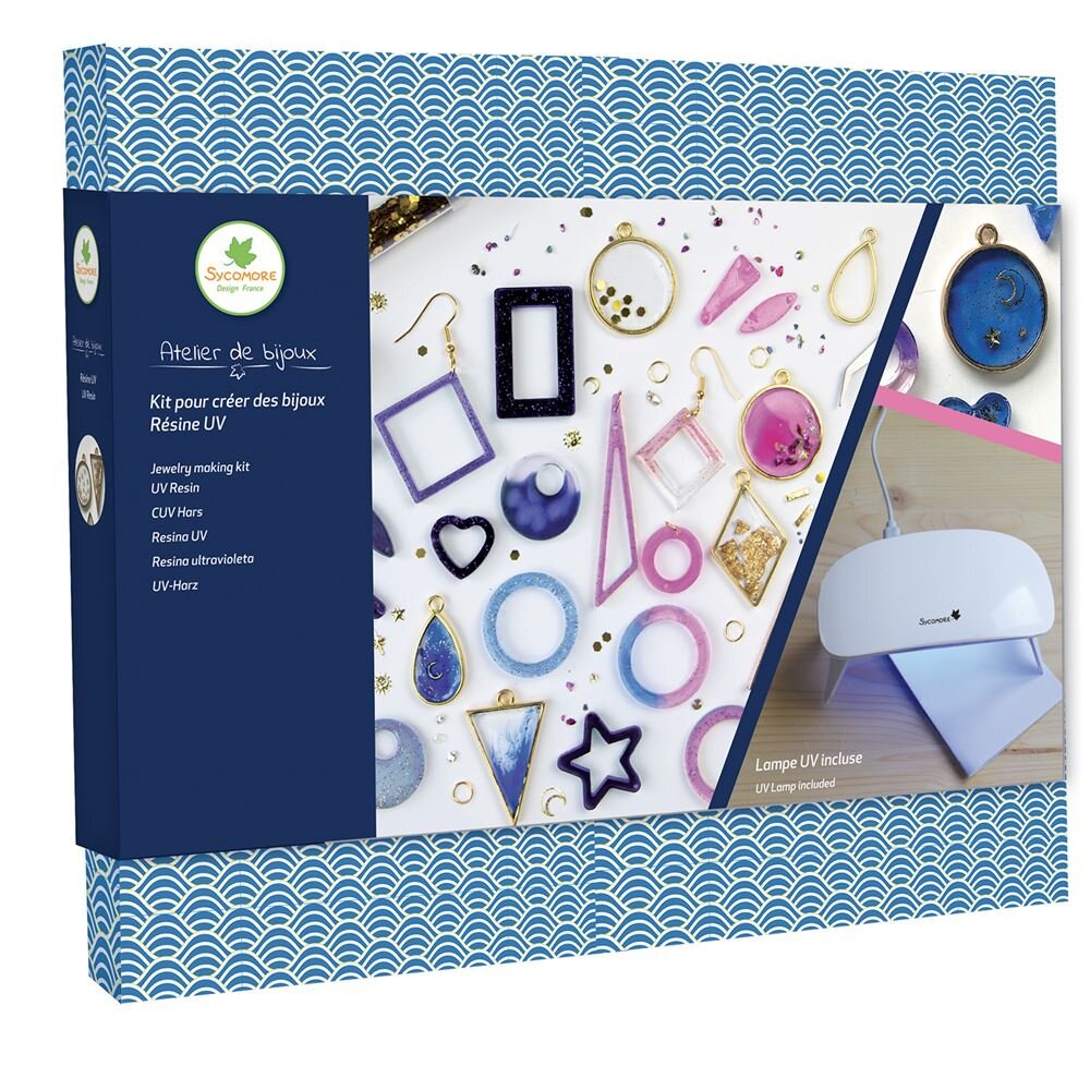 Balení obsahuje: 1 UV lampu, UV pryskyřici, spony, řetízek, prsteny, náušnice, lepidlo na šperky, nástroj na šperky (řezačka a kleště) a návod s různými modely.