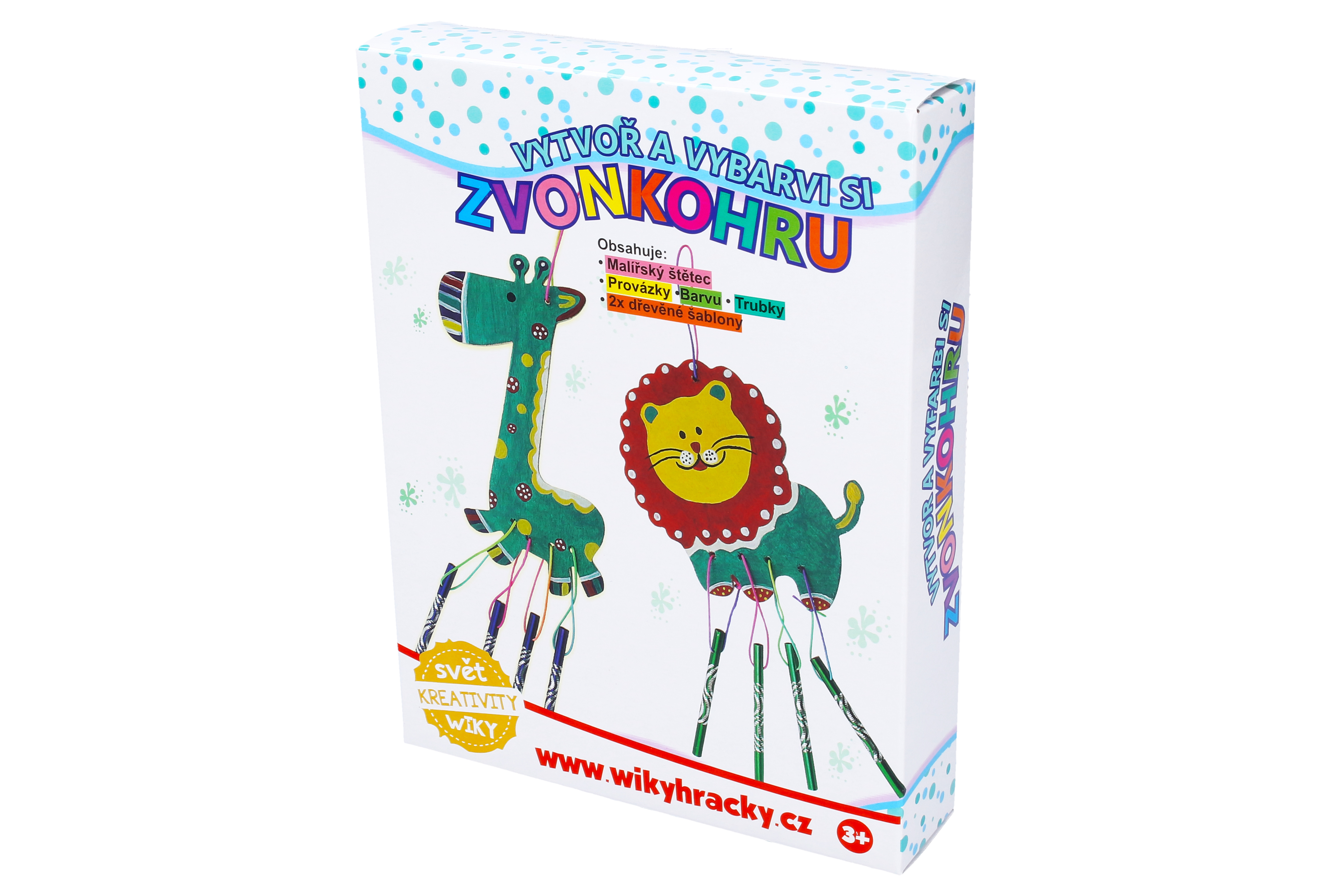 Kreativní set Zvonkohra. Vytvoř a vybarvi si zvonkohru. Obsahuje malířský štětec, provázky, barvu, trubky, 2x dřevěná šablona. číst celé