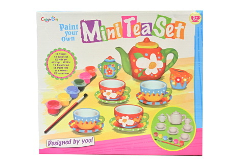 Kreativní sada Čajový set obsahuje porcelánový čajový set - konvičku o velikosti cca 10 cm X 8 cm,4 hrnečky s podšálky,2 džbánečky,6 barviček a štětec,návod.Věk 3+ číst celé