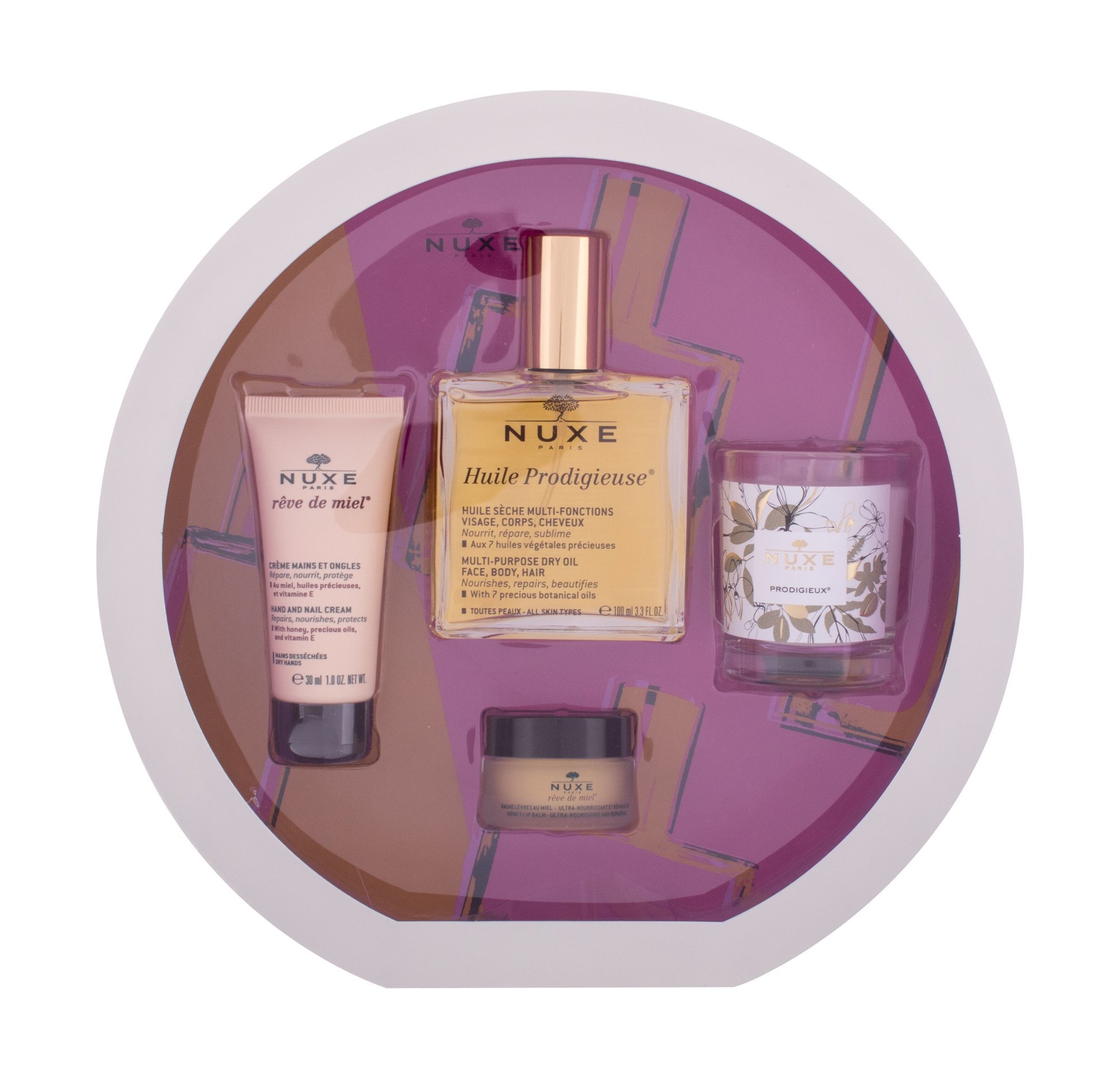 NUXE Prodigieusement Culte suchý olej Huile Prodigieuse 100 ml + krém na ruce Reve de Miel 30 ml + balzám na rty Reve de Miel Honey 15 g + vonná svíčka Bougie Prodigieux 70 g