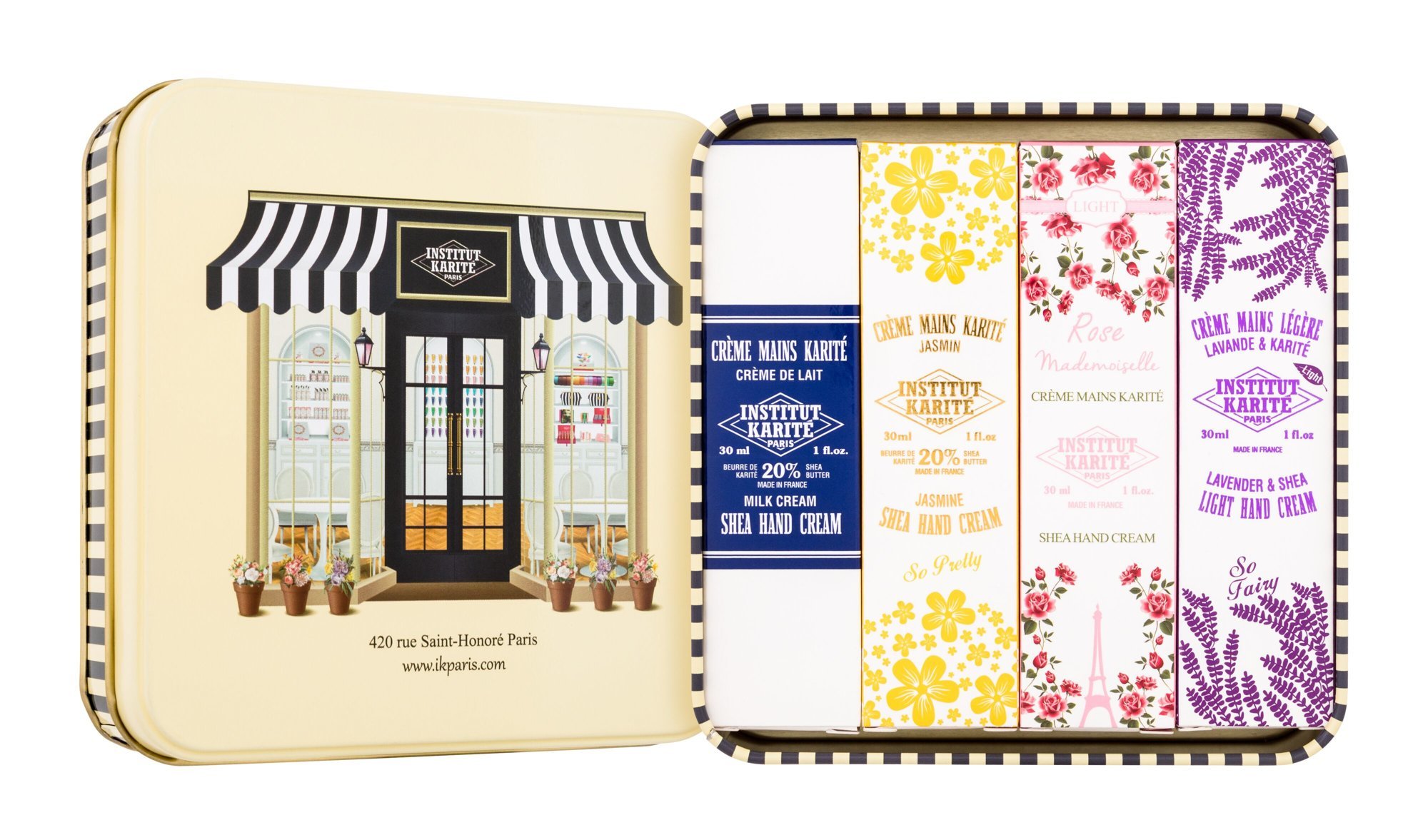 Institut Karité IKP Shop krém na ruce Shea Hand Cream Jasmine 30 ml + krém na ruce Light Hand Cream Rose Mademoiselle 30 ml + krém na ruce Light Hand Cream Lavender & Shea 30 ml + krém na ruce Shea Hand Cream Milk Cream 30 ml + plechová krabička
