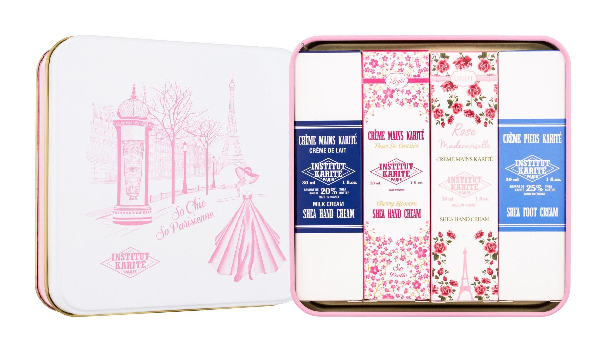 Institut Karité So Chic So Parisienne krém na ruce Light Hand Cream Rose Mademoiselle 30 ml + krém na ruce Shea Hand Cream Milk Cream 30 ml + krém na ruce Shea Hand Cream Cherry Blossom 30 ml + krém na nohy Shea Foot Cream Milk Cream 30 ml + plechová krab
