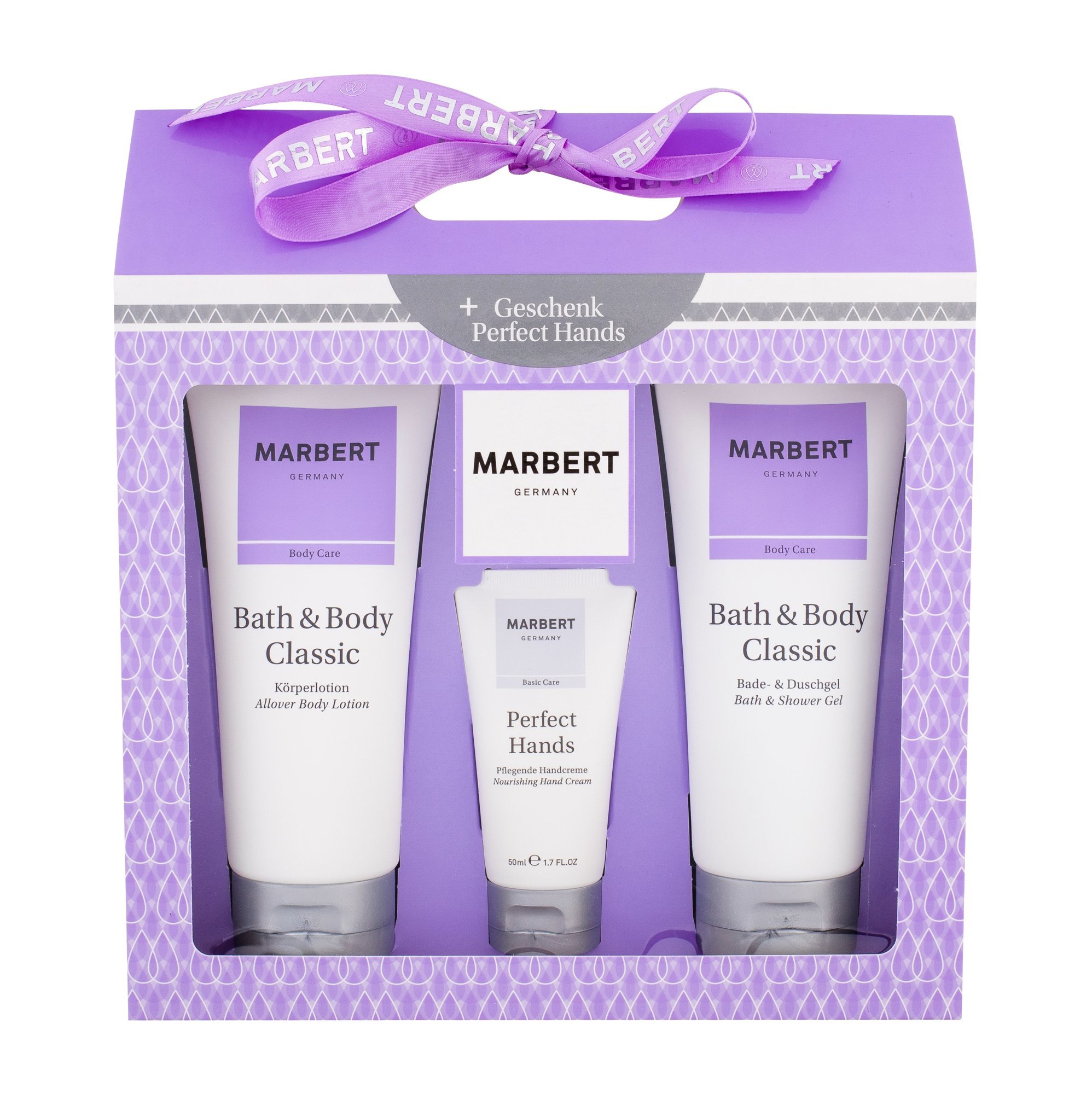 **Dárková sada Marbert Bath & Body Classic**. **Složení kazety:** sprchový gel 400 ml tělové mléko 400 ml krém na ruce 50 ml
