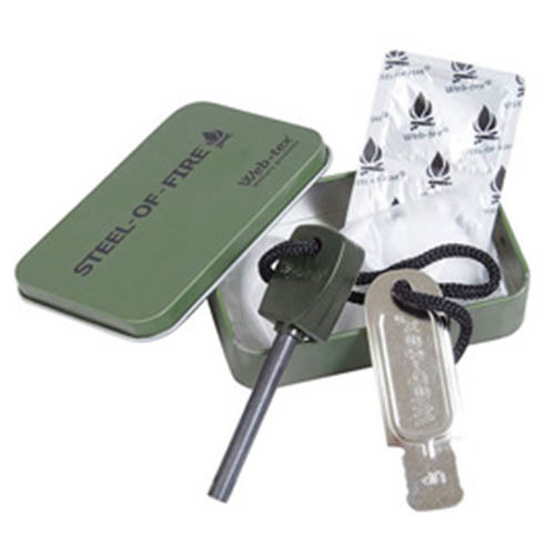 Praktická krabička se základními pomůckami pro rozdělání ohně . Obsahuje vatu, dvě tablety tuhého lihu a křesadlo s ocelovým škrtátkem.