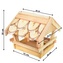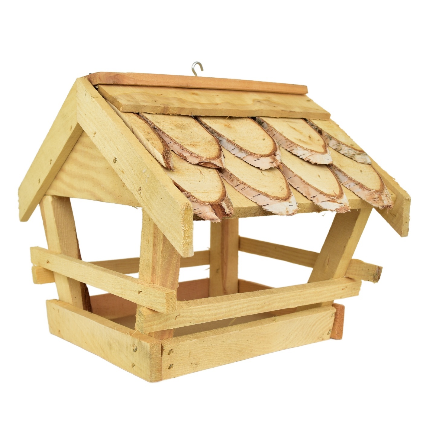 Břízová stříška s došky dokonale ochrání krmivo před deštěm a sněhem, zatímco stabilní konstrukce zajistí, že krmítko zůstane pevné při každém zavěšení. Praktický háček na horní straně umožňuje snadné zavěšení na strom, kůl nebo balkonové zábradlí.