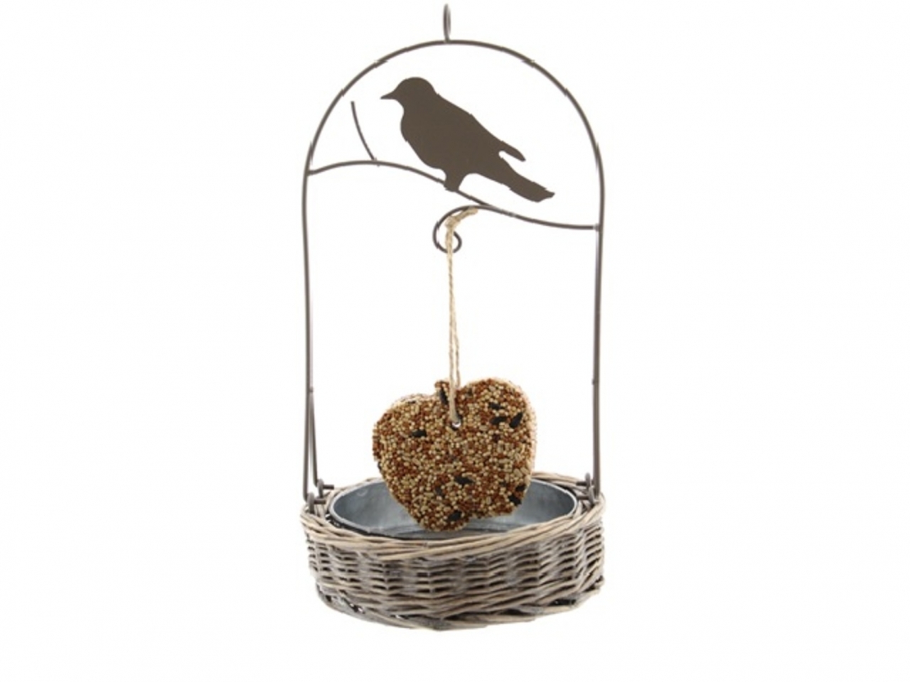 Kovové krmítko pro ptáky s proutěným košíkem, který má plechový vklad. Krmení není součástí balení.
