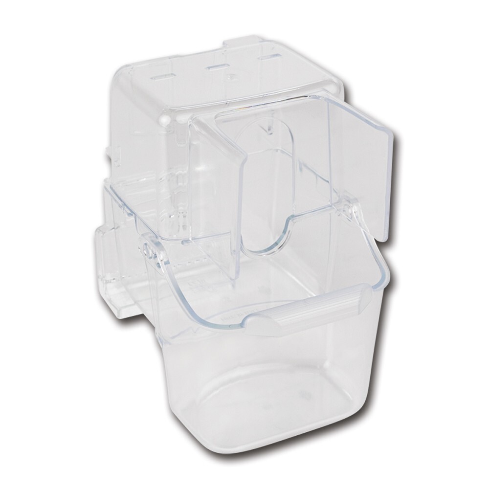 Krmítko je určeno k připnutí na dvířka klece, která se otevírají vodorovně. Jeho otvor o rozměru 13 x 12 cm a maximální rozteči drátů 1,9 cm zajišťují bezpečné a pohodlné dávkování. Díky ochraně krmiva před výkaly a nečistotami zůstává krmivo hygienické a čerstvé pro vaše ptáky.
