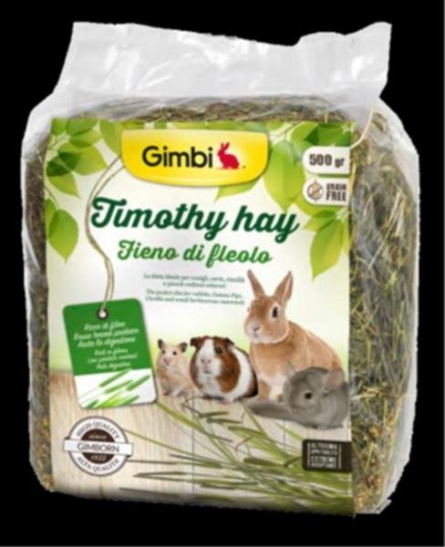 GIMBI TIMOTHY je speciální druh sena ze sušeného bojínku lučního. Obsahuje malé množství proteinů a velké množství vlákniny. Preventivně brání vzniku obezity a vysoký obsah vlákniny zlepšuje trávicí funkce. Snižuje problémy s tekutou stolicí, a plynatostí. Působí celkově protizánětlivě například proti bronchitidě, vnitřním infekcím, alergiim a podobně. Je také vhodný pro zvířata se sníženou chutí ke krmivu případě v rekonvalecenci. Aroma a chuť Bojínku lučního je pro hlodavce a králíky naprosto neodolatelná. Vyzkoušejte mu nabídnout zároveň Vaše běžné seno a sušený bojínek a uvidíte, že Váš hlodavec ocení jeho báječnou chuť.