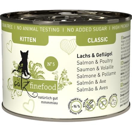Konzerva CF Classic Kitten No.5 se lososem, drůbežím masem a špenátem je ideální volbou pro chutnou, zdravou a vyváženou stravu vašich malých mazlíčků. Připravte svému kotěti jídlo, které nejen potěší jeho chuťové buňky, ale také podpoří jeho zdravý růst a imunitu.