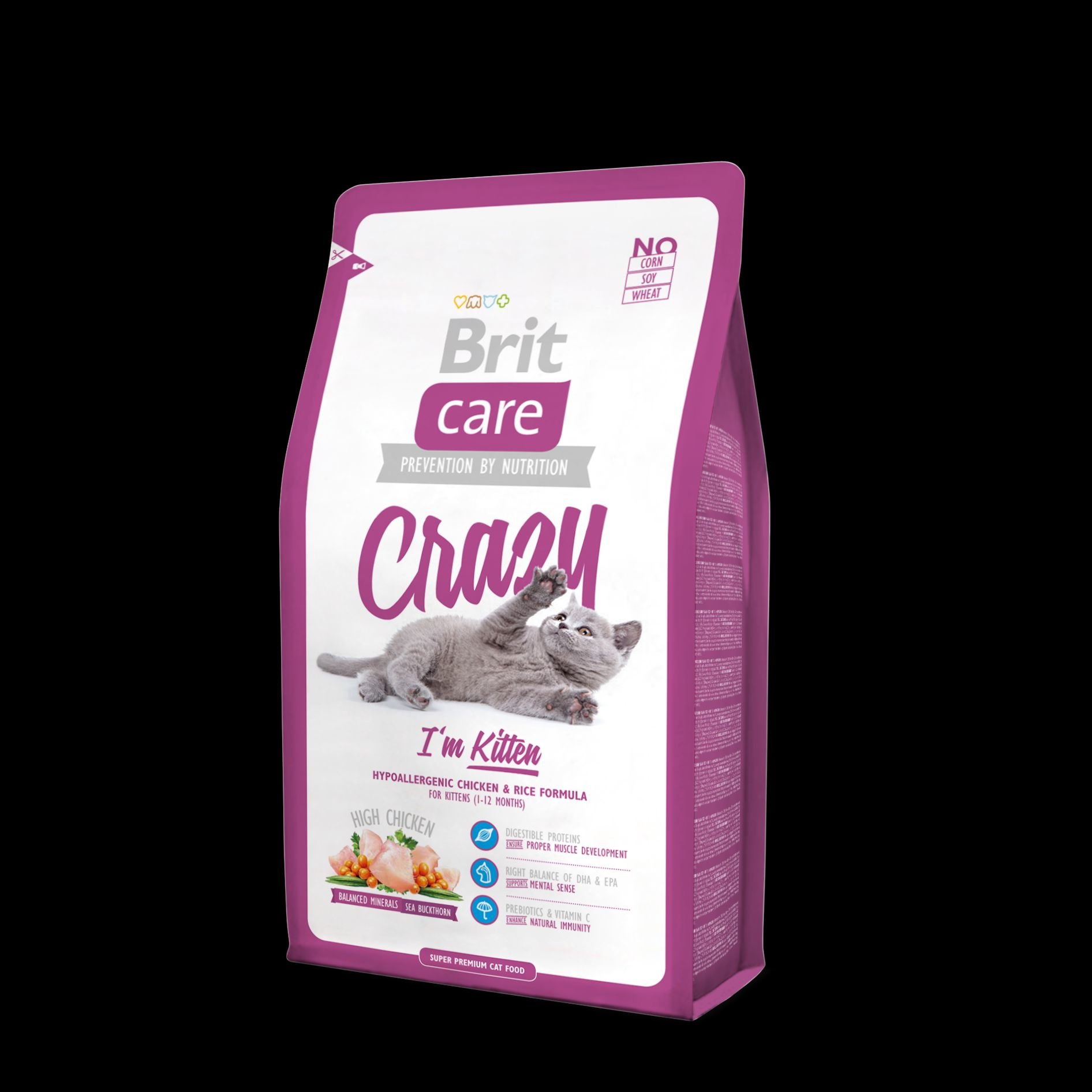Brit Care Crazy I´m Kitten Cat je kompletní superprémiové hypoalergenní krmivo s kuřecím masem a rýží pro všechny koťata. Superprémiové hypoalergenní kompletní kuřecí krmivo s rýží pro koťata (1-12 měsíců).