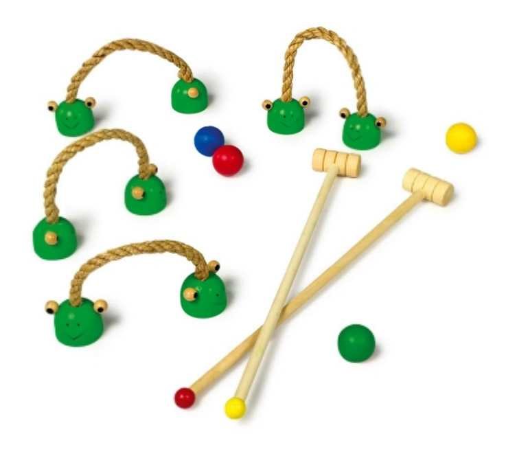 Sada obsahuje 10 kusů 2 pálky, 4 kuličky a 4 oblouky ze dřeva s lanem a s legračními obličeji žabky, to vše v síťovém obalu. Klasická verze kroketu pro vnitřní i venkovní použití. Německá firma Legler zaměřená na výrobu kvalitních dřevěných hraček od roku 1996. Všechny dřevěné hračky značky small foot mají označení CE a jsou vyráběny dle evropské normy pro bezpečnost hraček EN 71. Použité barvy jsou speciálně vyvinuty pro dřevěné hračky a jsou odolné i proti slinám dětí. Dřevo, které se používá pro tyto hračky, většinou pochází z lesnických společností zapojených do zalesňování. To nabízí všem zákazníkům možnost přispět k zachování přirozeně rostoucích lesů. Dřevěné hračky small foot jsou zářivě barevné produkty, které jsou vyrobeny převážně z přírodních surovin - dřeva. Dětem dělají radost od útlého věku, rozvíjí jejich hmatové a smyslové dovednosti. Cílem značky small foot je podporovat duševní a fyzický vývoj dětí.