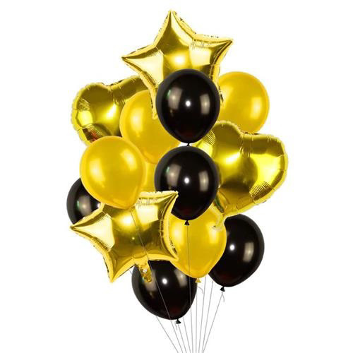 Sada prémiových latexových a fóliových balonků. Balení obsahuje 2 kusy foliových zlatých srdcí, 2 kusy foliových zlatých hvězdiček o průměru 45 cm a 10 kusů latexových černých a zlatých balonků o průměru 30 cm. Balonky jsou vhodné na nafouknutí heliem i vzduchem. Buket se hodí na oslavu narozenin, výročí, firemní oslavy i na jiné příležitosti. Barva: černá, zlatáObsah balení: 2 x zlaté foliové srdce, 2x zlatá foliová hvězda, 5 x zlatý latexový balonek, 5 x černý latexový balonekObjem celého buketu: cca 220 lObjem 1 ks balonku (folie i latex): cca15 lNafukování: vzduch nebo héliumVýdrž hélia v foliovém balónku: 2 - 5 dníVýdrž hélia v latexovém balónku bez ošetření gelem: 14 hod.Výdrž hélia v latexovém balónku po ošetření gelem: cca 3 dnyMateriál: Latex, kovová folieObchodní balení: AnoBalení: 1 ks