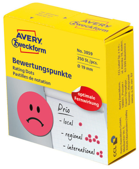 Etykiety kółka z do zaznaczania Smutna buźka, trwałe, 250 szt. rolka, 19 mm, czerwone, Avery
