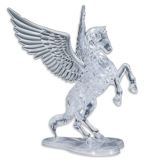 Krystalové puzzle 3D - Pegas - 42 dílků, HCM Kinzel. Trojrozměrné puzzle z barevného průhledného plastu z různě tvarovaných dílků. 3D model může mít podobu bájného pegase (s křídly) nebo koně vzpouzejícího se na zadních (bez křídel).
