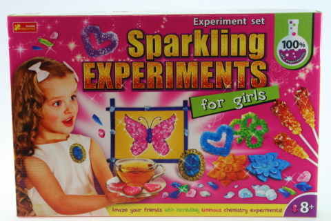 Zářivé experimenty pro všechny. Set obsahuje celkem 9 zářivých experimentů (vyrobení zářivé brože,okrasných krystalů a také sladkých krystalů). Sada obsahuje např. skalici modrou, kamenec, potravinářské barvivo, želatinu, třpytky, křídový prášek, sádru, brož, kelímky, barvy, formičky, ochranné brýle a plno dalšího. Rozměr balení cca 30 x 44 x 6 cm. Věk 8+. VYROBENO V EVROPĚ