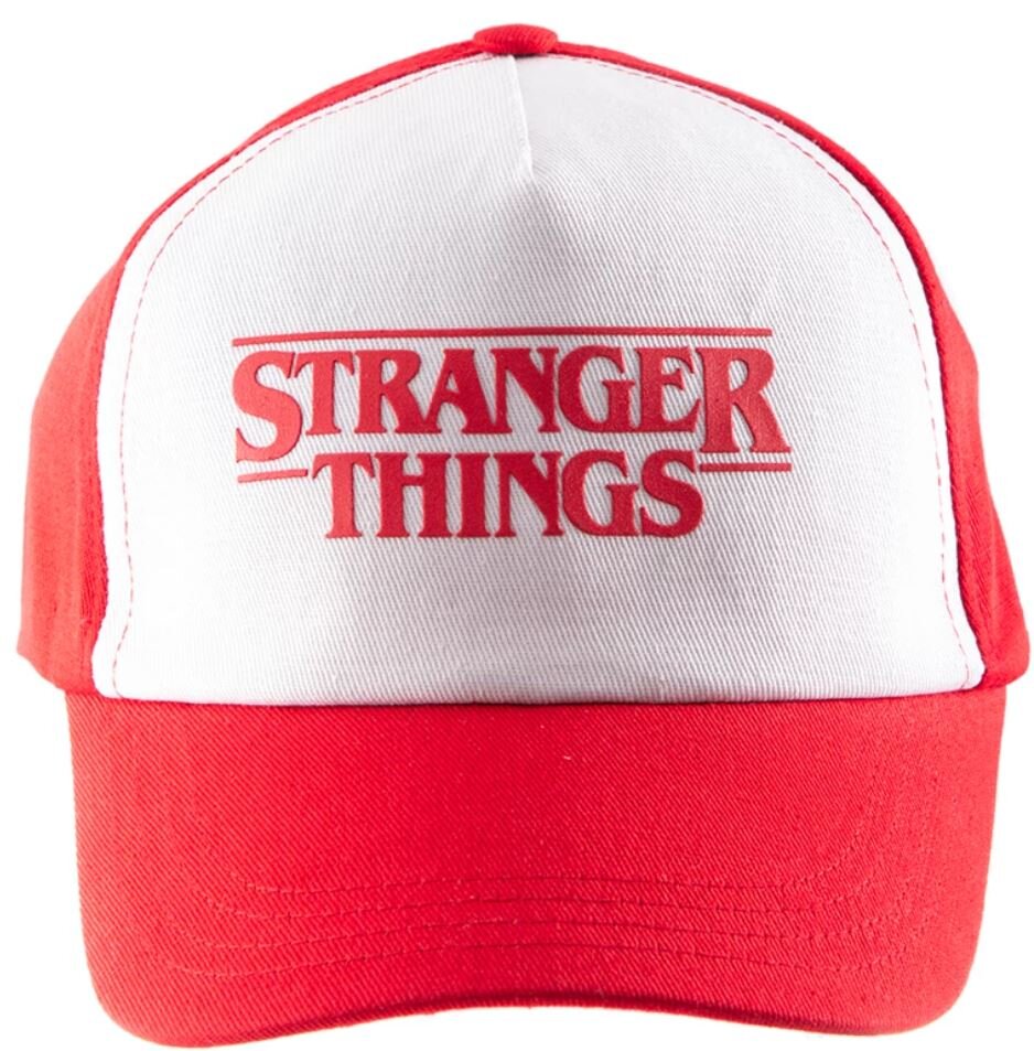 Červeno-bílá baseballová kšiltovka s logem seriálu Stranger Things.