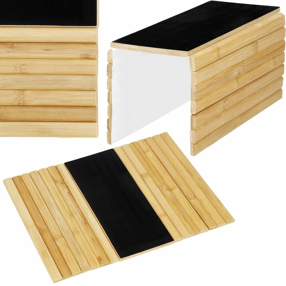 Praktická podložka na sedačku. Přírodní materiál, kvalitní zpracování. Vyrobeno ze 14 bambusových proužků. Dekorativní funkce na pohovce či na stole. Příjemný velurový materiál ve středu podložky. Univerzální využití, pohyblivá konstrukce. Snadno se skladuje. Praktický doplněk, tkerý najde využití jak v obyváku, tak v kuchyni.