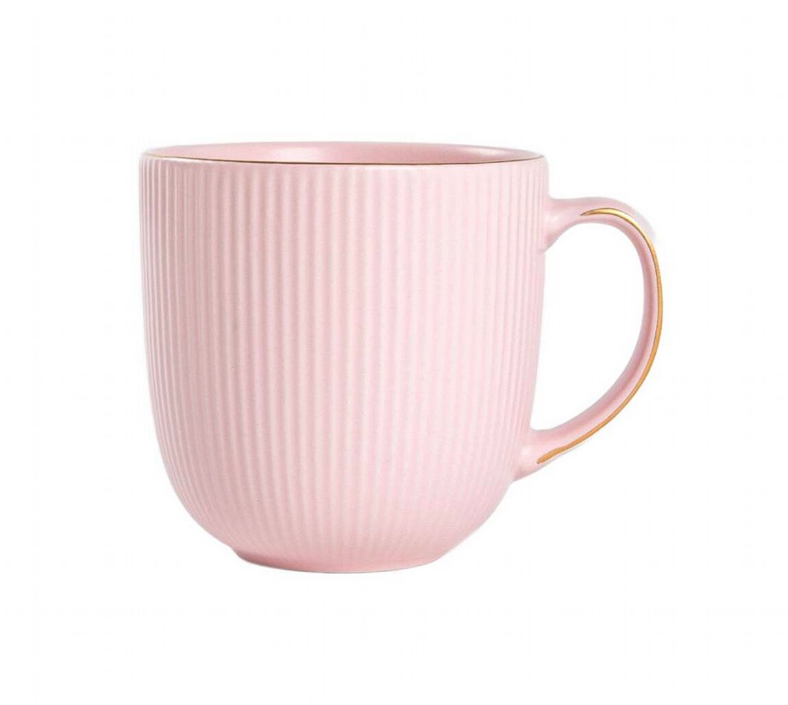 Elegantní porcelánový hrnek - Pastelová růžová barva - Jemné zlaté zdobení - Objem 350 ml - Růžový porcelánový hrnek 350 mlHrnek v pastelově růžové barvě má jemné zlaté zdobení na okrajích a dekorativní rýhovanou povrchovou úpravu. Porcelánový hrnek bude nejen krásnou dekorací, ale také ideálním...