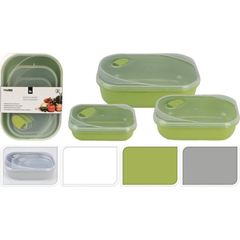 Celkem 3 plastové dózy na potraviny v šedé barvě s čirým víčkem. Jsou skvělým řešením pro převoz oběda, svačiny nebo také pro skladování potravin. V sadě najdete dózy s různým objemem, aby bylo možné uskladnit či přenášet různé druhy a porce jídel. Dózy se snadno uzavírají přesně padnoucím víčkem a jsou lehké a snadno přenosné, rozhodně jsou na cestování lepší než například skleněné dózy. Díky použití PP plastu bez obsažených BPA můžete v dóze rovnou ohřívat oběd v mikrovlnné troubě. Jsou vhodné i pro skladování potravin v lednici. Plastové dózy lze i s víčkem snadno umýt a opakovaně používat, což z nich dělá ekologickou alternativu k jednorázovým potravinovým obalům. Všechny tři boxy lze i s víkem stohovat do sebe, což velmi usnadňuje skladování.